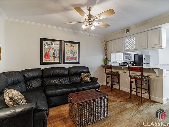 GAMEDAY Condo Suite 604 features two bedrooms, two bathrooms, and a northern facing view toward Prince Avenue. Upgrades include; LVP in living area, white cabinetry with stainless steel appliances. All GAMEDAY condos are fully furnished with all furniture, appliances, electronics, and household items included in the price. Georgia's GAMEDAY Center is the only property in Athens, GA with 24/7 Front Desk staff acting as concierge, on site housekeeping and on site handyman. Security cameras throughout the building and 5 level on-site parking deck. GAMEDAY is also the only hotel-condominium in Athens. OPTIONAL on-site management company will lease the condo for you when you are not there. The on-site management company leases nightly, weekly, monthly, and long term. Walk to Sanford Stadium and UGA campus. Association dues cover water, sewer, trash pick up, common area maintenance, insurance on building, hi-speed internet access, extended satellite television, security, and parking.