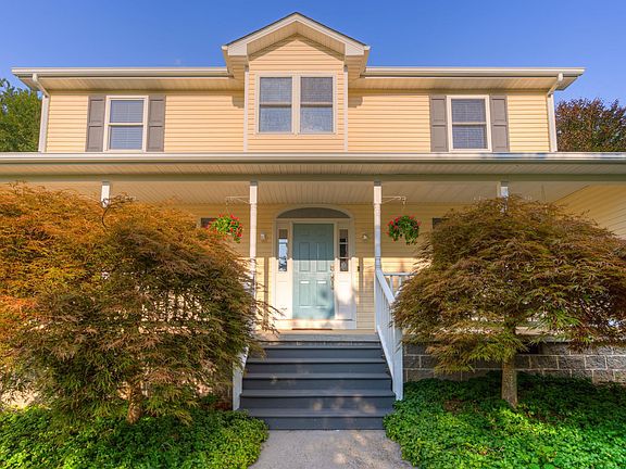Serene 4BR/4BA home atop 4 picturesque acres of rolling landscape with flowering trees in Montgomery County, convenient to Blacksburg, Christiansburg & Radford. This modern farmhouse has been well-maintained and tastefully updated. Main level features include covered front porch w/ swing, HW floors, large living room w/ gas fireplace and access to spacious deck w/ sun shade & cable railing, fabulous eat-in kitchen w/ granite counters & tile backsplash, ceramic tile floors, stainless steel appliances, maple cabinets & walk-in pantry, formal dining room, mudroom, laundry room, full hall bath and a primary suite with ensuite bath. Upper level offers 3 spacious BRs including another large primary suite w/ ensuite bath & walk-in closet, and a full hall bath. Other features include a spacious workshop, oversized 2 car garage, barn, small pond and fenced area off deck. This gem offers the best of both worlds: rural park-like setting within minutes of the amenities of town.