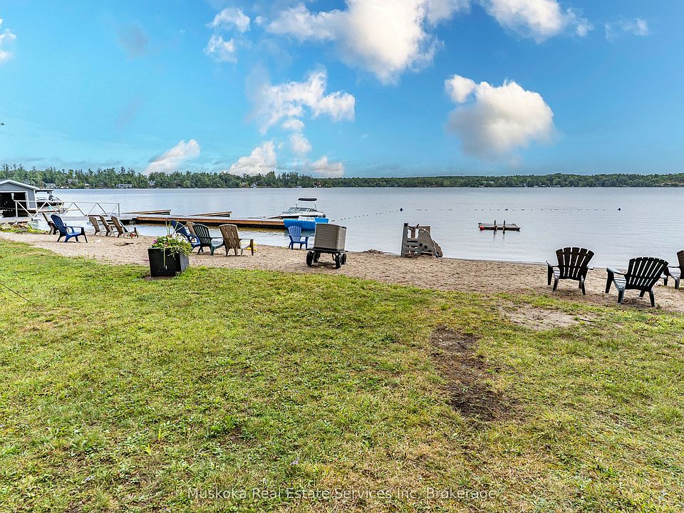 Past History. Shortly after the war large parcels of land on various lakefronts large enough for 12 cottages were purchased by groups of families. There are several locations in Gravenhurst area. The cottages in this location are individually owned and share - a Tennis Court, Parkette for kids play and family gatherings, Docking for your boat and about 200 feet of Sandy Beachfront on Lake Muskoka. Today this community is enjoyed by many several families enjoying the same love of Muskoka. Due to it's close location to Gravenhurst -10 min. walking distance - there is Municipal water & cable TV unlike most homes or cottages on or near Lake Muskoka. Your assigned Docking Slip is large enough for a your Ski Boat. A rack for canoes and kayaks is located at the beach as are picnic tables and beach toys for all to use. The beachfront is hard packed sand wide enough for separation of those reading and those playing and all ages enjoy the lakefront view. The 'Open Concept' living area of home/cottage allows the chef to participate in the family and guest discussions easily....the living - dining- kitchen is comprised of one great living area. There are 3 bedrooms and 2 bathrooms - one on each floor, one with a shower and the other with a tub. There are two 28' sundecks...one is full length on the lower floor and another full length balcony on the upper floor. There are many conveniences near by...Pickle ball and two full size municipal tennis courts and Park several golf courses including Muskoka Bay Golf Course, ranked among the best in Canada and several more in the area. The Historic Opera House has evenings of Theatre and Music. Music on the Barge at Rotary Gull Lake Park every Sunday. Several nice restaurants. And the Segwun Steamship is great for your visitors to enjoy a pleasant afternoon. Signs are on the property. The path to the beach is right in front of your fully winterized cottage/home.