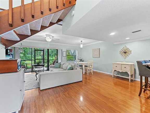 Welcome to the beautiful, gated community of East Lake Woodlands! This move-in ready townhome offers the perfect blend of comfort and convenience with maintenance-free living. Step into this updated 2-bedroom, 2.5-bath home, filled with natural light and overlooking a private back patio with a tranquil pond. Enjoy observing wildlife from your secluded screened-in porch, with visits from deer to native birds. The open-concept living room, dining area, and kitchen create an inviting space for entertaining guests. The bright kitchen features a second private patio area, spacious enough for outdoor dining and equipped with ample storage. Upstairs, you'll find the laundry area and two bedrooms. The primary bedroom offers a serene view of the backyard pond, a walk-in closet, and an ensuite bathroom. A long driveway provides ample parking, while the covered carport ensures your vehicle is protected. Residents can relax at the community pool located just around the corner. As a resident of East Lake Woodlands, enjoy membership opportunities at the newly renovated Ardea Country Club, featuring a variety of amenities such as TWO 18-hole golf course, full-service restaurant and bar, fitness center, pickleball and tennis courts, and a calendar full of member events. The HOA fee includes roof maintenance, cable, internet, grounds maintenance, and more, offering exceptional value and convenience. Don’t miss your chance to own a piece of this exclusive neighborhood!