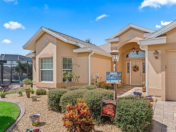 Paradise awaits in this 3 Bed / 2 Bath one owner Lantana Designer with 29’x13’ Heated Swimming Pool at the end of a quiet cul-de-sac in one of The Villages’ most convenient locations-the coveted Village of Hadley; From the moment you arrive, you'll be impressed by the picture-perfect curb appeal, featuring professionally landscaped grounds and a Stamped Concrete driveway and walkway. The landscaped exterior showcases curbing-framed rock beds with trees creating an impressive curb appeal. Situated on a generously sized 0.32-ACRE OVERSIZED beautifully landscaped lot. You enter the foyer through a welcoming front door framed by a transom window and adorned with LEADED GLASS matching sidelights. Inside, the foyer boasts Diagonal TILE floors, which continue into the Kitchen, Dining and Living rooms, creating an elegant and cohesive flow throughout the main living areas. The HIGH, VAULTED CEILINGS make the house feel roomy and comfortable. The Kitchen features Granite Counters with Tile Backsplash, Stainless Appliances, French Door Refrigerator w/water & ice in door, Recessed Lighting, Breakfast Bar with Pendant Lights, Closet Pantry & Tile Flooring. This kitchen also includes a generous breakfast nook with a window for lots of natural light. The Primary Bedroom is located in the back corner of the home for maximum privacy. This spacious Primary Suite includes Vaulted Ceiling, Carpet, extra-large closet and a bath with double vanities, zero walk-in shower, tile flooring, and a private water closet. Bedrooms two and three are located in the front corner of the house. The front Guest Room includes a Vaulted Ceiling and has a Bow Window bump out in the front. Both guest bedrooms have closets and share the Guest Bathroom which has a Tiled Shower/Tub combo. There is a Hall Linen closet. Just off the Kitchen is the Inside laundry with Upper Cabinets, Utility Sink and Tile Flooring. Other upgrades and features include-Knockdown Ceilings-No Popcorn; Exterior Paint 2023; Roof 2023; HVAC 2020; Whole House Water Purifying System 2025; Golf Cart included. Oversize 24’x25’ Garage with shelving, storage cabinets; The attic is very spacious and has flooring over the garage full length and entered thru the pull-down attic stairs. The Pool with colored lights is surrounded by Stamped Concrete and enclosed by an extra-large BIRDCAGE which is framed by Palm trees for added privacy creating a private oasis you can enjoy all year long AND you have a Poolside Outdoor kitchen for entertaining. Havana Country Club, Odell Recreation Center close by; Shopping, Dining, Banking, Medical and more available at Colony Shopping Plaza; this property is located between Lake Sumter Landing & Brownwood Town Square both with live music, restaurants, shopping, and movie theaters seven nights a week. Many golf courses and other entertainment choices, all accessible by a golf cart… Room Measurements and Square Footage are approximate and should be verified by buyer/buyer’s agent. All information is deemed reliable but not guaranteed.