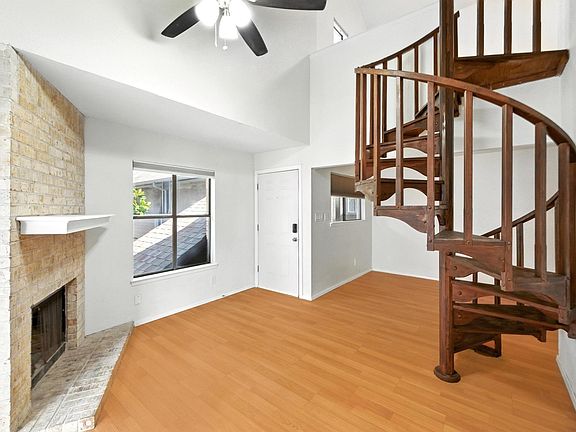 Delightfully refreshed and updated affordable corner unit in The Woodlands. Desirable 2nd story corner unit overlooking the pool and common area. Flexible floor plan with bonus loft square footage, soaring ceilings and private balcony overlooking the pool. Stately brick fireplace anchors the light filled living room. Recent cosmetic updates include designer Zia tile backsplash, new LW LVP mezzanine flooring, ceiling fans, paint, new sliding patio door, kitchen cabinets, countertops and stainless steel appliances. Energy updates under the Austin Energy Weatherization Assistance program in early 2025 include duct replacement, insulation, lighting, smart thermostat and other improvements to substantially decrease energy use and cost. Loft square footage is totally usable but NOT counted in square footage, has ample space for an office or bedroom use plus a walk-in closet. Gated community with controlled access for security. All appliances including washer & dryer included. Best value in the complex. Fantastic central location, easy access to everything.