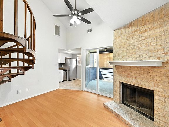 Delightfully refreshed and updated affordable corner unit in The Woodlands with 3.25% assumable mortgage. Perfect for a first time buyer on a budget. Desirable 2nd story corner unit overlooking the pool and common area. Flexible floor plan with bonus loft square footage, soaring ceilings and private balcony overlooking the pool. Stately brick fireplace anchors the light filled living room. Recent cosmetic updates include designer Zia tile backsplash, new LW LVP mezzanine flooring, ceiling fans, paint, new sliding patio door, kitchen cabinets, countertops and stainless steel appliances. Energy updates under the Austin Energy Weatherization Assistance program in early 2025 include duct replacement, insulation, lighting, smart thermostat and other improvements to substantially decrease energy use and cost of ownership. Open floor plan could easily be converted to a 1+1 or 2 bedroom just by adding a short wall or two. Loft square footage is totally usable but NOT counted in square footage, has ample space for a office or bedroom use plus a walk-in closet. Assumable 3.25% mortgage at half current mortgage rates make this net-net one of the most affordable units in Central Austin. Unusual combination of price, condition, energy efficiency and location. Fantastic central location, easy access to everything.