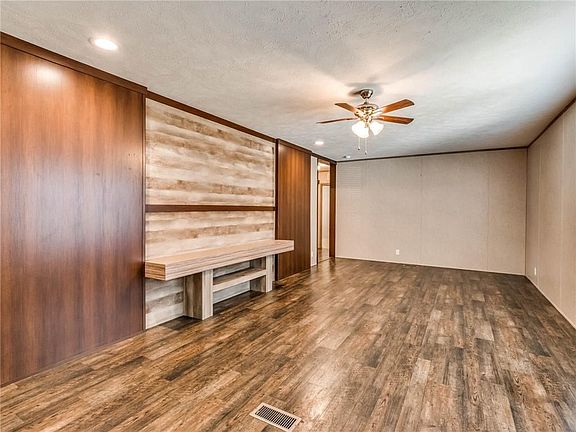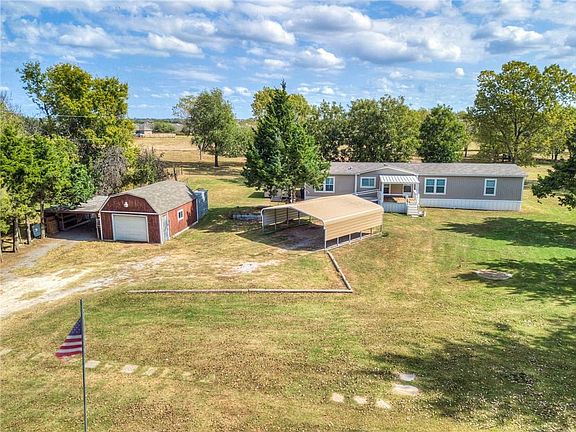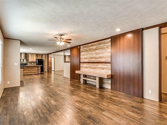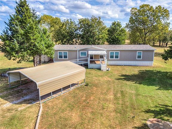 4 bed 2 bath Manufactured home on 1.2 Acres in Mustang Schools. Home was built in 2017, 2 living rooms, split floor plan, beautiful lament floors throughout. Property is fully fenced in, Detached garage, storage building and outdoor storm shelter. Do not miss this one.