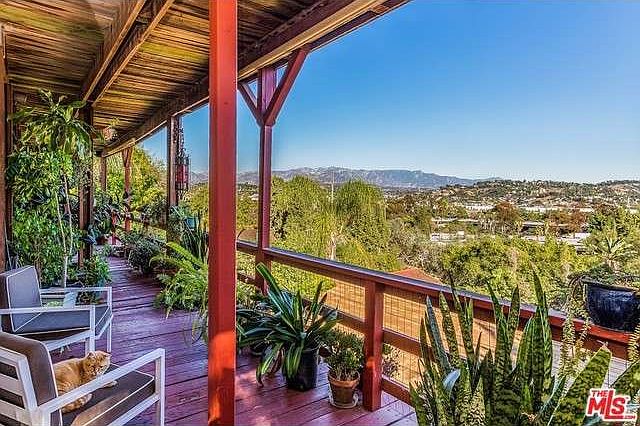 Mid-Century compound in Silver Lake Hills! Two detached homes on a lot, PLUS an attached guest house! The 1966 Mid-Century front home is 3 stories, approx. 3000sqft, 3 beds, 3 baths on the top two floors, floor to ceiling windows, two fireplaces, laundry room, wrap around balconies - spectacular 180 degree views! Below is the attached guest quarters with separate entrance, kitchenette, and private wrap around deck. This front home can be divided into 3 separate living spaces. The top floor has a kitchenette, LR, bedroom, bath, and a separate entrance through the side garage. In the back of the property is the original 1915 cabin-like home, nestled on the bottom of the hill and surrounded by trees and nature, it has been renovated and features one bed/one bath plus bonus room, an over-sized wood deck, laundry inside, wood floors, and a bonus room. 2 single car garages, plus 4 additional driveway parking spaces. A rare find in Silver Lake hills!
