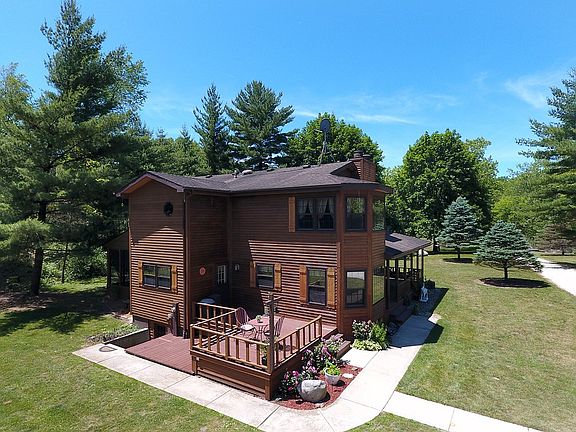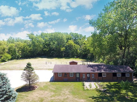 Beautiful country setting with this 5.43 acre property. Sit back and catch a breeze on your wide wrap around porch. Large portion of porch is fully screened in. This spacious 4 bedroom home has 2 full baths and 1 half bath. Large master suite has private master bath along with a sitting area for reading your favorite book. Bathrooms have just been fully updated. On the cool evenings, sit back and enjoy the wood burning stone fireplace. Second fireplace is located in the basement which is ready for your design to finish. Basement also has exterior access. Setting back off the road past the ponds, this home is fully equipped with a very clean and neat horse barn. Barn is 70' Long x 25 Wide with 8' Extended Lean to across the entire back which is used for hay storage or storing equipment. Barn has frost proof hydrant in the tack area. There are 4 horse stalls one of which is being used as a deluxe chicken coop but may easily be returned back to a stall. Barn is connected to a large pasture area with separation area. This home is very universal for many uses not to mention it is in the Goose Lake Homeowners association and has all lake rights. This property has a very efficient and large 2 tank septic system and also is fully equipped with an RV hookup. Call now for your private showing!