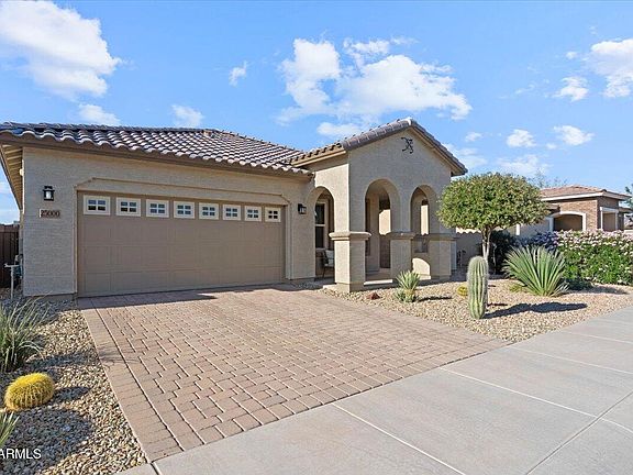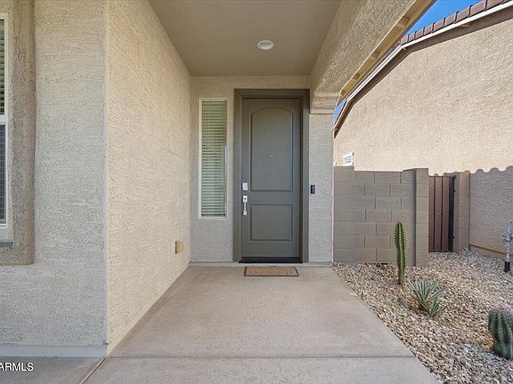 The kitchen is a true centerpiece, featuring crisp white cabinetry, stainless steel appliances, and a large island perfect for casual dining or entertaining. The primary suite offers a spacious retreat with dual sinks, a walk-in shower, and direct access to the laundry and kitchen for effortless everyday flow. Step outside to your private backyard retreat - complete with a large covered patio, extended low-maintenance desert landscaping, and a touch of artificial turf framed by mature cactus and blooming shrubs. It's the perfect balance of easy upkeep and peaceful outdoor living.