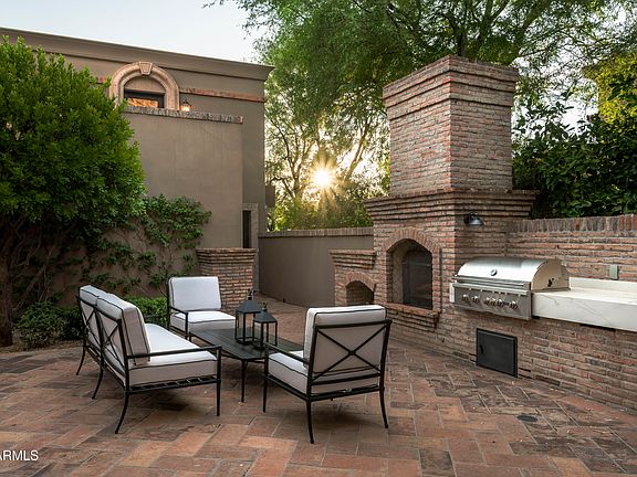 Inside, timeless details abound—cantera stone, custom wooden beams, marble finishes, and expansive indoor-outdoor spaces that embody the essence of Scottsdale living. Multiple fireplaces warm the residence, from the elegant great room to the floor-to-ceiling brick fireplace in the chef's kitchen, which features top-of-the-line appliances and refined finishes.