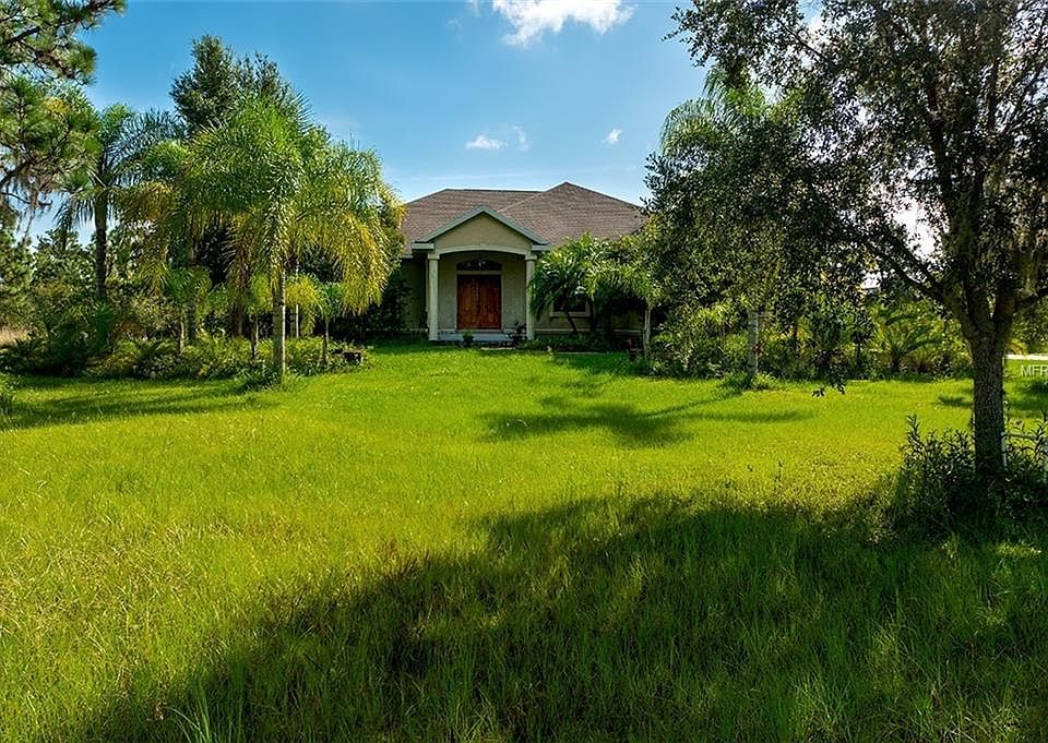 This is a very unique corner property in Pomello Ranch. Its a three bedroom two and a half bath home that has a media room and office with beautiful built ins. There is a large heated pool with spa and 4.68 acres in a natural Florida setting which includes a pond. The unique thing about this property is it has a 2600 sf steel work shop that has its own entrance on the property. It can be used for your ongoing business or a place to put all your toys. The main home has separate dining and living rooms, split bedrooms, media room, office, and large master bedroom ensuite. The master bath includes duel sinks, separate tub and stand up shower. The kitchen features granite counters and upgraded wood cabinets and stainless steel appliances.