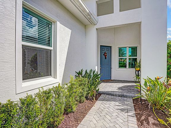 Lowest priced waterfront single family home in PGA Verano! Gorgeous Kolter built Bella Model offers 2 Bedrooms, 2 Bathrooms and a 2-Car Garage. Den/office that could easily become a third bedroom. Custom lighting fixtures, warm brown cabinetry, hi hats, impact windows and volume ceilings throughout. Walk in and be greeted by natural light and serene water views. Kitchen is spacious and features 42'' cabinetry, a breakfast nook, pantry and a snack bar for barstools. Open concept kitchen, dining and living area are great for entertaining. Enjoy the screened in porch with sunrise views in the morning and sunset views from your front porch in the evenings. Primary bedroom offers water views and a spacious primary bathroom including double sinks, 2 walk in closets and a standalone frameless shower. Guest bedroom near the front of the home located right next to the guest bathroom. Third room with double doors is currently being used as an office but could also make a great hobby room or additional bedroom. Laundry room has cabinetry for storage. Garage floor with epoxy coating. Turn the backyard into your own oasis with room for a pool. This home is private and located in a low-traffic location near the end of a cul-de-sac. Impact windows throughout provide peace of mind from storms. Whole home gutters and two patios, one screened and one open air. Come enjoy the Florida lifestyle with all the PGA Verano has to offer. 27 court pickleball facility, indoor and outdoor pools, men's and women's saunas, locker rooms, multiple fitness facilities. Community offers a resistance swimming pool, resort style pool and an indoor pool. Additional features include basketball courts, tennis courts, miles of walking paths, a dog park, library, ballroom, demonstration kitchen and a full calendar of social activities. HOA includes internet, basic cable, landscaping, alarm, manned-gate security, common area maintenance and all the amenities. Call today for a private showing.