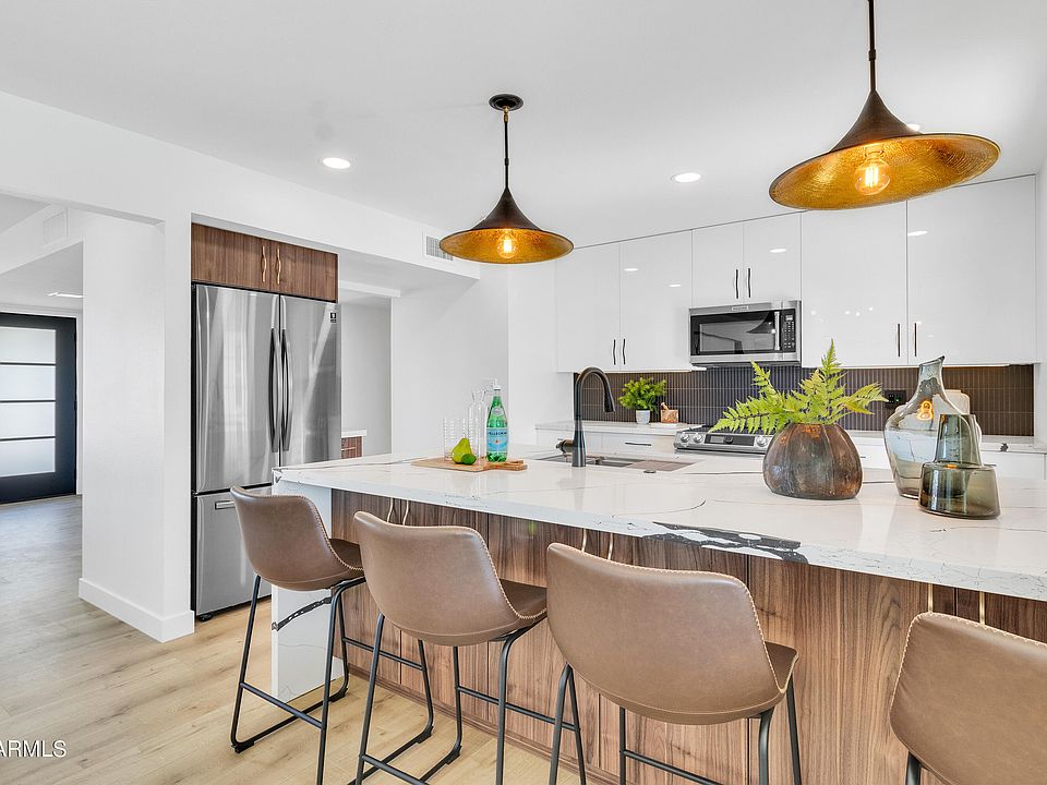 Spectacular views, freshly renovated w/ $100k+ invested, this mid-century modern stunner is move-in ready. Piestewa Peak, city lights & sunset vistas. Modern designer finishes throughout. Dramatic kitchen boasts new 42'' cabinets, quartz counters, lg. double-sided island, slide-in 5-burner range w/ built-in air fry, stainless appliances & 32'' workstation sink. Open plan kitchen, dining & family room, complete w/ wood burning fireplace. Sunny primary bedroom features a window seat, newly renovated ensuite bath w/ entrance to backyard. Guest bath dazzles w/ new vanity, quartz & dimensional tile. New front door, waterproof plank floors & baseboards. Fresh paint inside & out; new lighting & newer windows. Large, tiled laundry room; 2-car garage. NO HOA. Private pool w/ new pump & filter. New pool skimmer to be installed prior to COE.