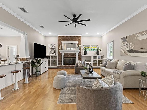 Step into an entertainer’s paradise with this remarkable custom-built single-story home, crafted in 2000 and set on an expansive 1.6-acre lot. Designed for gatherings and everyday luxury, this home boasts 3 bedrooms, 2.5 baths, an office large enough to be a 4th bedroom, and an oversized 3-CAR GARAGE perfect for vehicles, projects, and toys. This original owner is also the builder and spared no expense on safety and construction of the home including a 50-YEAR ROOF. A beautiful covered front porch with French doors welcoming you into the foyer, where classic elegance meets modern comfort. To your left, the SOLID OAK WOOD FLOORS lead to a formal dining room, ideal for hosting dinners, while to your right, a cozy living room features a charming brick WOOD-BURNING FIREPLACE that invites relaxation. The living room flows into a chef’s dream kitchen, fully equipped with top-of-the-line appliances. It includes a premium WOLF GAS RANGE, double built-in ovens, two spacious islands, a pantry, and abundant cabinet and counter space with a FARMHOUSE SINK. The kitchen also offers a breakfast bar, ideal for casual dining or socializing while cooking. The mix of countertop materials provides something for every use, the islands feature a trendy butcher block, the sink counters are premium granite and near the stove you'll find a stainless steel work surface. A LARGE LAUNDRY & MUDROOM, located conveniently off the kitchen, provides additional storage and easy access to the garage. The oversized 3-CAR GARAGE has room for workspaces, storage and parking. The entertainment space continues with a vast 23 x 28-foot GAME ROOM featuring a half bath and direct access to a covered rear patio, where French doors invite indoor-outdoor living. This game room leads seamlessly into a dedicated THEATER ROOM for the ultimate movie nights or sports viewing experience—perfect for all kinds of entertainment. The master suite is a true retreat, featuring an elegant fireplace, a spacious walk-in closet with custom built-ins, and a luxurious ensuite bathroom. This spa-inspired bathroom includes MARBLE flooring, a CLAWFOOT TUB beneath a chandelier, double vanities, and a walk-in shower, combining sophistication and comfort. Two additional large bedrooms are well-appointed with plush carpeting and share a second full bath with a clawfoot tub, a chandelier light and a spacious WALK-IN SHOWER all adorned in marble tile. Outdoors, this property transforms into a tropical escape. The highlight is the ZERO ENTRY POOL AND SPA with rock waterfall features, surrounded by lush landscaping that creates a private oasis. An expansive covered rear porch provides a shaded space for entertaining, outdoor dining, or simply relaxing. The property also includes a MINI GOLF COURSE for practicing your putts, a basketball court for recreation, and a detached 12'x28' STORAGE SHED with electricity, for extra convenience. With upgrades like beautiful hardwood floors, crown moldings, and thoughtful touches throughout, this home combines timeless elegance with modern amenities. This one-of-a-kind property offers not only a home but a lifestyle—don’t miss the opportunity to make it yours!