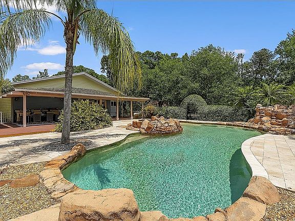 Under contract-accepting backup offers. Step into an entertainer’s paradise with this remarkable custom-built single-story home, crafted in 2000 and set on an expansive 1.6-acre lot. With NO HOA, NO CDD Tax this home is the ONE! Designed for gatherings and everyday luxury, this home boasts 3 bedrooms, 2.5 baths, an office large enough to be a 4th bedroom, and an oversized 3-CAR GARAGE perfect for vehicles, projects, and toys. This original owner is also the builder and spared no expense on safety and construction of the home including a 50-YEAR SHINGLE ROOF. A beautiful covered front porch with French doors welcoming you into the foyer, where classic elegance meets modern comfort. To your left, the SOLID OAK WOOD FLOORS lead to a formal dining room, ideal for hosting dinners, while to your right, a cozy living room features a charming brick WOOD-BURNING FIREPLACE that invites relaxation. The living room flows into a chef’s dream kitchen, fully equipped with top-of-the-line appliances. It includes a premium WOLF GAS RANGE, double built-in ovens, two spacious islands, a pantry, and abundant cabinet and counter space with a FARMHOUSE SINK. The kitchen also offers a breakfast bar, ideal for casual dining or socializing while cooking. The mix of countertop materials provides something for every use, the islands feature a trendy butcher block, the sink counters are premium granite and near the stove you'll find a stainless steel work surface. A LARGE LAUNDRY & MUDROOM, located conveniently off the kitchen, provides additional storage and easy access to the garage. The oversized 3-CAR GARAGE has room for workspaces, storage and parking. The entertainment space continues with a vast 23 x 28-foot GAME ROOM featuring a half bath and direct access to a covered rear patio, where French doors invite indoor-outdoor living. This game room leads seamlessly into a dedicated THEATER ROOM for the ultimate movie nights or sports viewing experience—perfect for all kinds of entertainment. The master suite is a true retreat, featuring an elegant fireplace, a spacious walk-in closet with custom built-ins, and a luxurious ensuite bathroom. This spa-inspired bathroom includes MARBLE flooring, a CLAWFOOT TUB beneath a chandelier, double vanities, and a walk-in shower, combining sophistication and comfort. Two additional large bedrooms are well-appointed with plush carpeting and share a second full bath with a clawfoot tub, a chandelier light and a spacious WALK-IN SHOWER all adorned in marble tile. Outdoors, this property transforms into a tropical escape. The highlight is the ZERO ENTRY POOL AND SPA with rock waterfall features, surrounded by lush landscaping that creates a private oasis. An expansive covered rear porch provides a shaded space for entertaining, outdoor dining, or simply relaxing. The property also includes a MINI GOLF COURSE for practicing your putts, a basketball court for recreation, and a detached 12'x28' STORAGE SHED with electricity, for extra convenience. With upgrades like beautiful hardwood floors, crown moldings, and thoughtful touches throughout, this home combines timeless elegance with modern amenities. This one-of-a-kind property offers not only a home but a lifestyle—don’t miss the opportunity to make it yours!