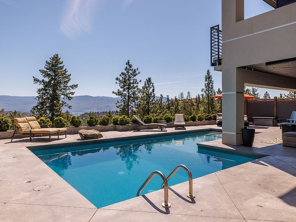 Luxurious and elegant custom build home (2020) featuring a stunning 4,400 sf home with impressive mountain, lake, and valley views. This 4-bedroom, 4-bathroom showstopper boasts high ceilings, large windows, a floor-to-ceiling gas fireplace. The chef's kitchen includes high-end appliances, an induction cooktop and quartz countertops and is complemented by a butler's pantry with a fridge/freezer. The open concept main floor opens to a large deck and offers the ideal indoor/outdoor living experience.  The primary bedroom is conveniently located on the main floor and boasts a spacious ensuite with large shower, heated floor and an impressive walk-in closet complete with laundry chute. On the lower floor there are 3 bedrooms, 2 of which share a Jack and Jill washroom.  An additional washroom provides access to the lower deck and pool. Added features include a media room, family room, gym. Enjoy the convenience of a triple garage with an EV plug and hot water tap, as well as smart home features, security system, underground sprinklers and radiant heat in the basement. The outdoor oasis includes an in-ground pool with a diving tank and dive rock, hot tub, and large decks for entertainment. This peaceful cul-de-sac has golf, fishing, walking trails, and ATV trails all at your doorstep, don't miss it!