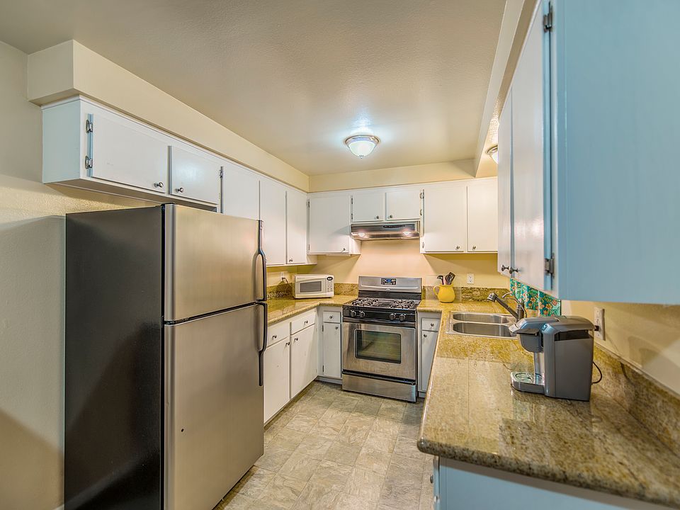 Great 1 bedroom condo in the very popular Pueblo complex. Remodeled kitchen with granite countertops and stainless steel appliances. The Pueblo offers a number of very attractive features such as pool, spa, gym, bbq area, tennis, volleyball, handball courts and pool table. Community laundry is conveniently located. HOA includes gas, electricity, water and trash. This unit comes with an assigned parking space in the gated parking area