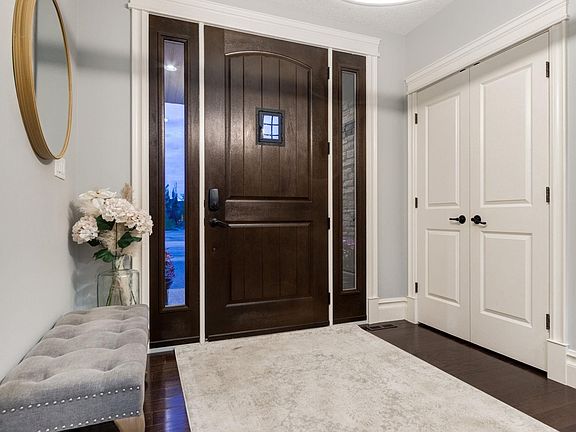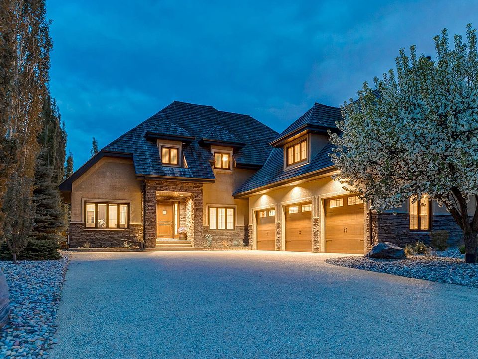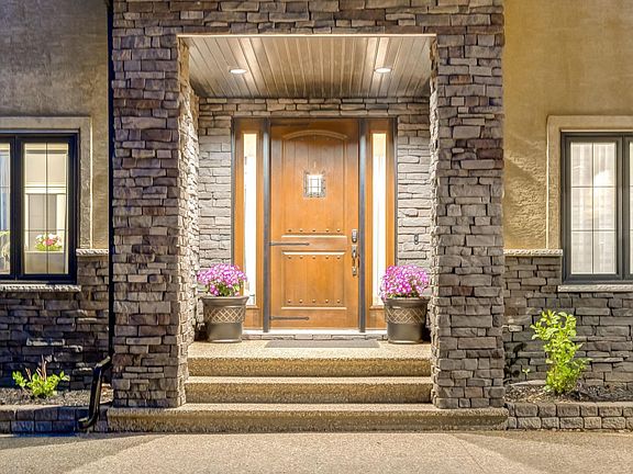 This stunning custom-built residence in prestigious Riverstone Pointe blends refined elegance, functionality, & luxurious finishes throughout. The grand foyer opens to a central wood-burning fireplace, hardwood floors, a den, & a private office. Soaring ceilings & large windows fill the main floor with light. The living room features a vaulted ceiling & stone fireplace, flowing into a chef’s kitchen with granite counters, gas stove, island, & walk-in pantry. Step outside to a large deck with a sunken hot tub, gas fire tables, & outdoor dining. Upstairs offers four spacious bedrooms, including a Jack & Jill suite, a second ensuite bedroom, & a private primary retreat with vaulted ceiling, fireplace, spa-like ensuite, & massive walk-in closet. The fully finished basement includes a rec room with bar, fifth bedroom, steam shower, & more. An oversized triple garage & full-size outdoor hockey rink with heated dressing room complete this one-of-a-kind property Luxury, privacy, & lifestyle have come together.