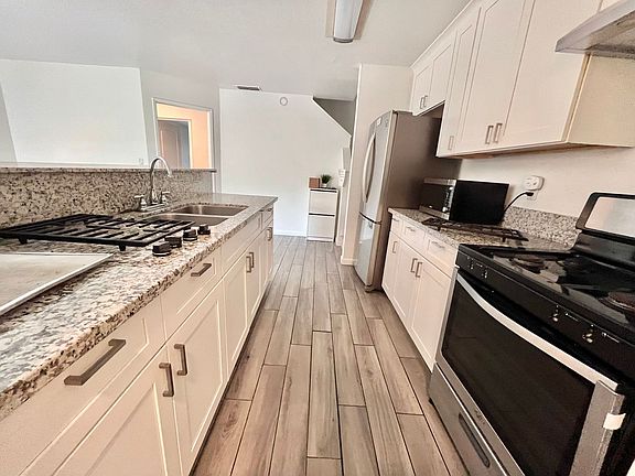 Inside, the kitchen features generous cabinet space, a dishwasher, stove/oven, and a functional bar area. The living room includes a sliding glass door that opens directly to the backyard, making it easy to enjoy indoor-outdoor living.