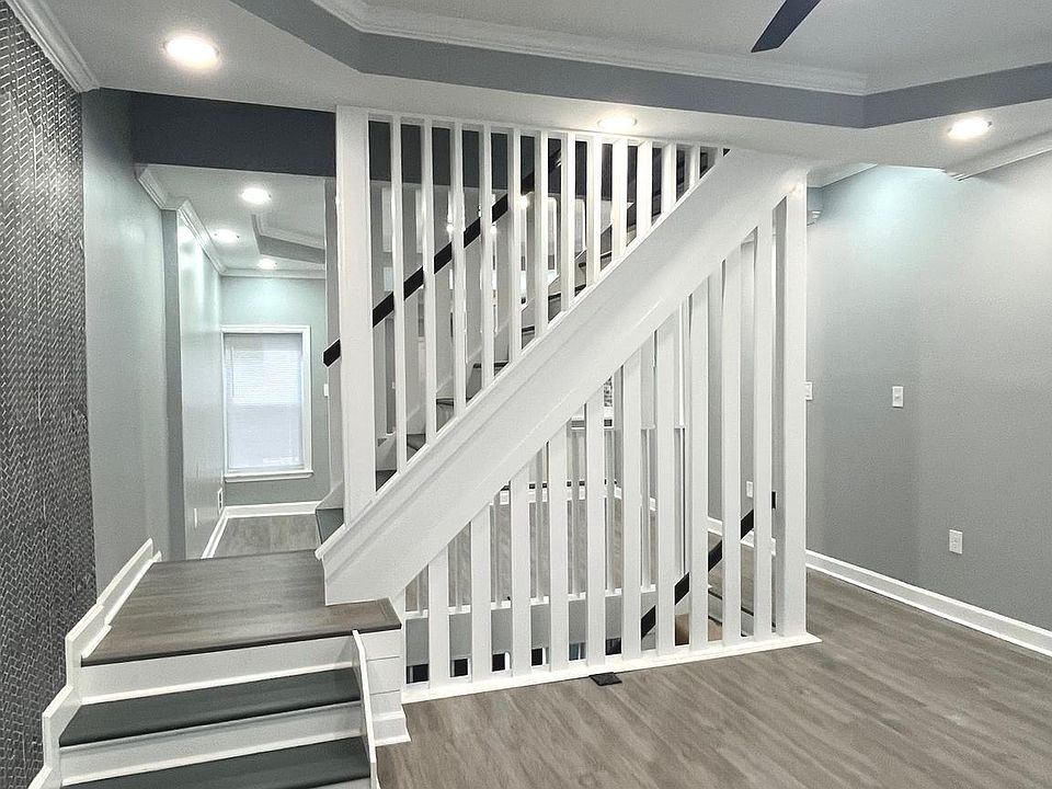 Gorgeous accent stairwellTray ceilingsOak hardwood floorsStainless steel appliancesBlack tiled accent wallGranite countertopsOpen floor concept