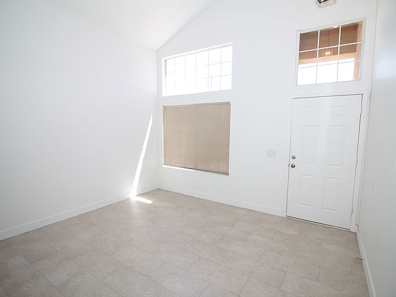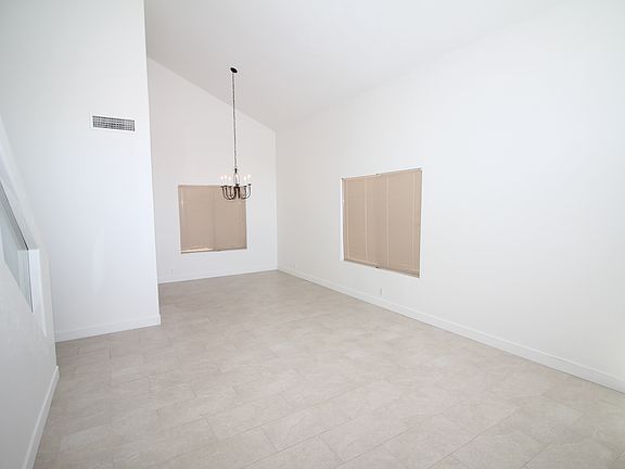 Step inside to find a bright and inviting interior featuring vaulted ceilings, easy maintain tile flooring, and decorative light fixtures throughout. The living and dining area is filled with natural light.