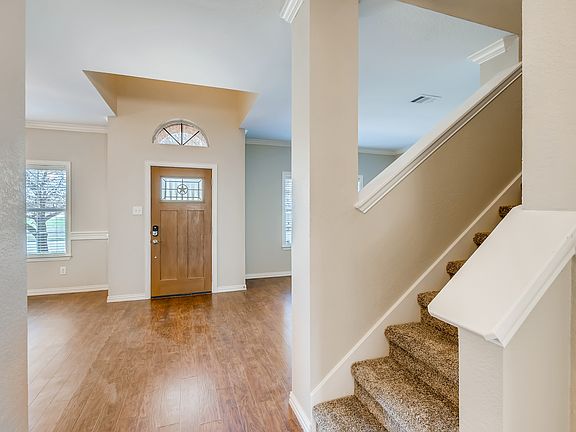 Fall in love with this stunning 4 bedroom, 2.5 bathroom brick beauty in highly desirable Lakeline Ranch. A 2 story foyer and functional entryway welcome you into harmoniously combined shared spaces. Wood-look laminate floors sweep across arched entryways into a vast open living room that enjoys a wood-burning fireplace. Cooking and entertaining are made easy in the adjacent chef's kitchen, outfitted with crisp white cabinetry, stainless steel appliances, durable countertops, and a large middle island with a custom woodblock. The kitchen opens to a breakfast area that overlooks and leads to a private backyard. Tucked away towards the back of the home is a secluded primary bedroom with high vaulted ceilings and a dreamy en-suite bathroom complete with an expansive soaking tub, a separate shower, and a sizable walk-in closet. Upstairs you will find a bonus living room and generously sized bedrooms. Additional features include a laundry room, an oversized 2 car garage, and a deck. Enjoy quick access to the community pool, track and field area, schools, shopping, dining, and toll roads.