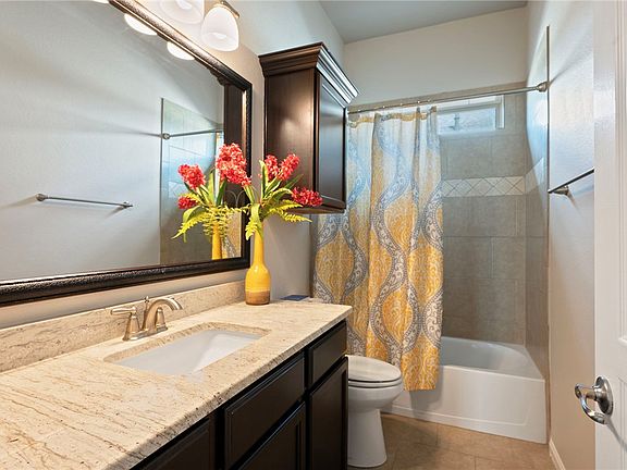 Retreat to the secluded primary suite, a haven of tranquility featuring an expansive bedroom with lofty ceilings and plush new carpeting. The spa-like en-suite bath impresses with a luxurious rain shower, stone-accented flooring, a deep soaking garden tub, a large vanity with two sinks, a spacious walk-in closet, and convenient access to the laundry room.