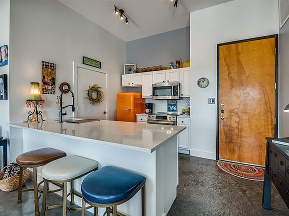 Rare opportunity to own an extensively updated loft style condo, offering East Dallas views through tall windows in a bright and open floorplan with 10' wood-beamed ceiling. The newly remodeled kitchen is the focal point of the open layout that integrates living, dining & kitchen areas. The sparkling kitchen showcases a full Bosch appliance package, gleaming quartz counters, polished concrete floor, and a custom tile backsplash. The home is brightly lit with morning sun but can be darkened with remote controlled solar powered blinds along the wall of oversized windows. The generous open plan living area has polished concrete floors and enjoys expansive views as you look down on the city below. The bath has been updated with a spa-like frameless glass shower enclosure and chrome rain spray head, ceramic floors, granite counters and upgraded cabinetry. Other amenities include a walk-in closet, exposed ducts, exposed wood beams & columns, secure entry garage with assigned parking, a fitness center, landscaped private courtyard swimming pool, and a great downtown location convenient to everything. Retro refrigerator, Washer & Dryer are negotiable. Most furniture & decor available for separate purchase.