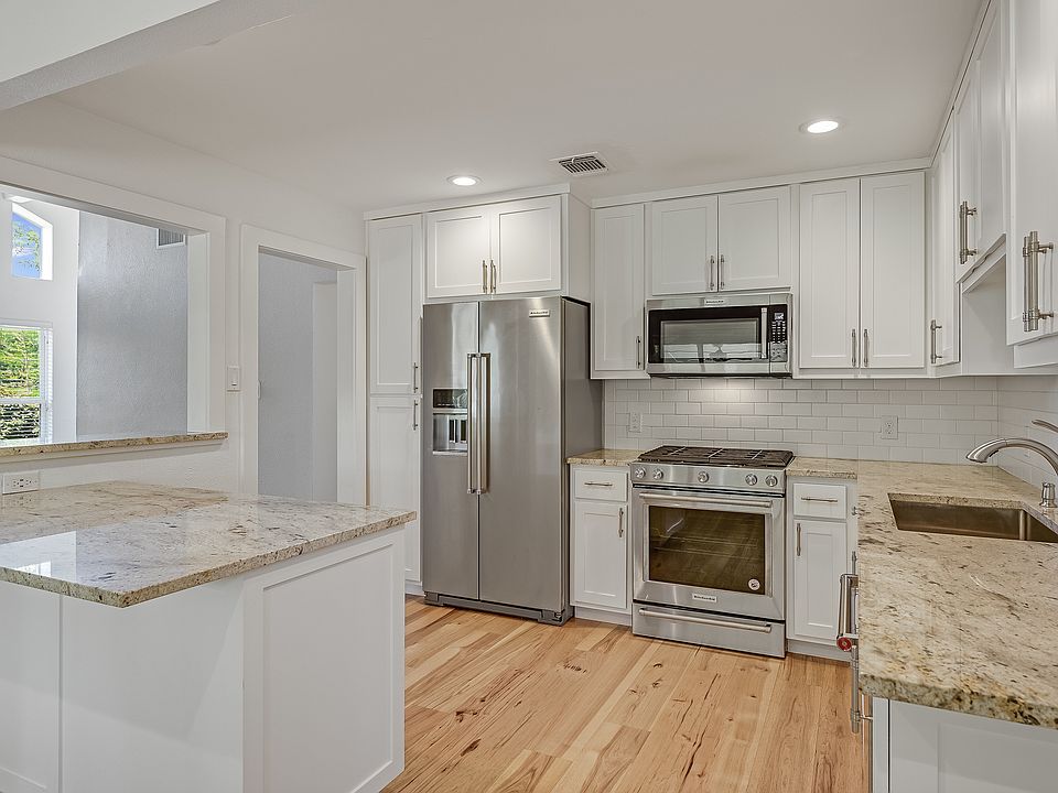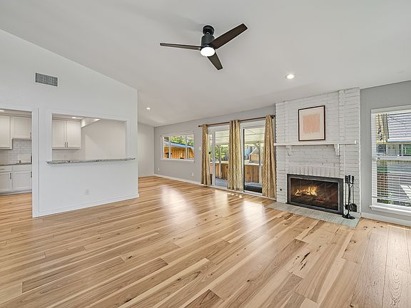 Beautifully updated three-bedroom, two-bath open floor plan condo with high ceilings nestled in the cozy community of Cinnamon Hollow. You will enjoy the gourmet kitchen that was completely updated in 2017 with custom cabinetry, granite, and KitchenAid stainless appliances. Other updates include, but are not limited to Brushed Hickory wood floors, double-paned windows, sliding glass doors, a personal patio off the primary bedroom refreshed with brick/wood aesthetics, a roof replacement in 2019, and exterior paint in 2022. The laundry closet located in the garage is a must-see and is easily accessible from the primary bedroom as well. Enjoy entertaining outside under the covered back patio. With a quick commute into Downtown Austin, this quaint community features a large pool with a cabana and lounge area and greenbelt with walking trails. All appliances will convey with the sale.