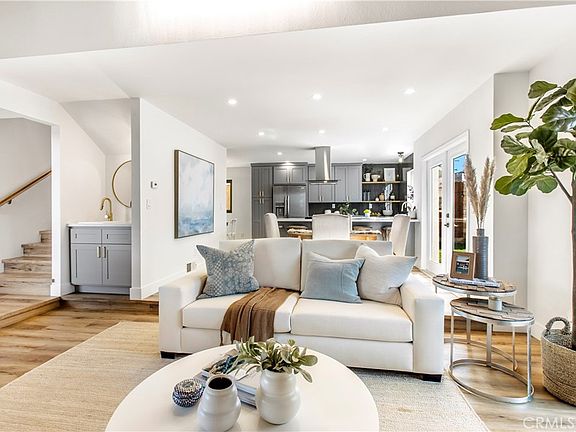 Welcome home to this turnkey and completely free-standing townhome that sits like a single-family home. Relax in the spa-like atmosphere while you peer up at the high ceilings, with recently refinished wood floors underfoot, and experience an abundance of natural light in this open floor plan. On the main level, the fireplace sets the cozy, inviting, and well-designed space to enjoy. As soon as you walk in the door you feel at ease with a formal dining area, a casual living room, and a kitchen with an oversized peninsula with a cooktop, perfect for informal dining and entertaining. The kitchen has granite countertops, stainless steel appliances, and plenty of cabinet space. The kitchen sink window frames views of the private backyard area which is easily accessible through sliding doors from the spacious family room. Outside is a nice combination of a patio for a table and grill as well as a grassy area for the dogs or children. Upstairs has all 3 bedrooms, 2 full bathrooms, an office space, and the washer and dryer. With recessed lighting, skylights, and a wet bar area, this is an entertainer's dream. The primary suite has vaulted ceilings and includes a large walk-in closet, a bathroom shower, dual sinks, and a walk-in shower. Other features include a front yard, fresh paint on the interior and exterior, and direct access to a 2-car garage. Centrally located close to the beach with easy freeway access, enjoy So Cal living at its finest in this lovely home.