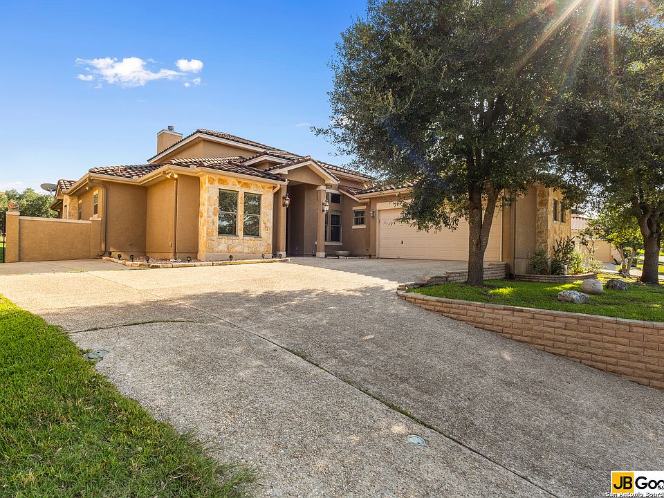 Elegant single-story custom Mallorca plan on a .29-acre greenbelt lot in gated Estancia within the Heights at Stone Oak. This 3,008 sq ft home offers 3 bedrooms each with private bath, a study, and half bath. Soaring 10-ft ceilings, rounded corners, and designer tile throughout create a timeless backdrop. The great room features a floor-to-ceiling stone fireplace and walls of windows. A chef's kitchen boasts granite counters, gas cooktop, pot filler, large island, custom oak cabinetry with crown molding, and a walk-in pantry. The private owner's suite includes patio access, dual vanities, jetted tub, frameless shower, and spacious walk-in closet. Upgrades include hard-maple cabinets, extended covered patio, patio/gazebo with dedicated connection for a future hot tub, granite backsplashes, upgraded plumbing/lighting, reverse-osmosis water system, and sound system wiring. Energy-efficient features include dual HVAC, low-E windows, PEX plumbing, and an oversized garage. Neighborhood amenities: guarded gate, security patrol, Olympic-style pool, tennis & basketball courts, sand volleyball, and NEISD schools.