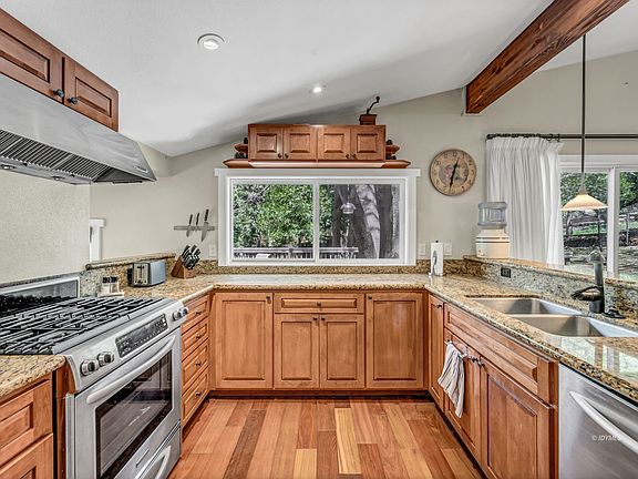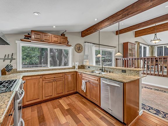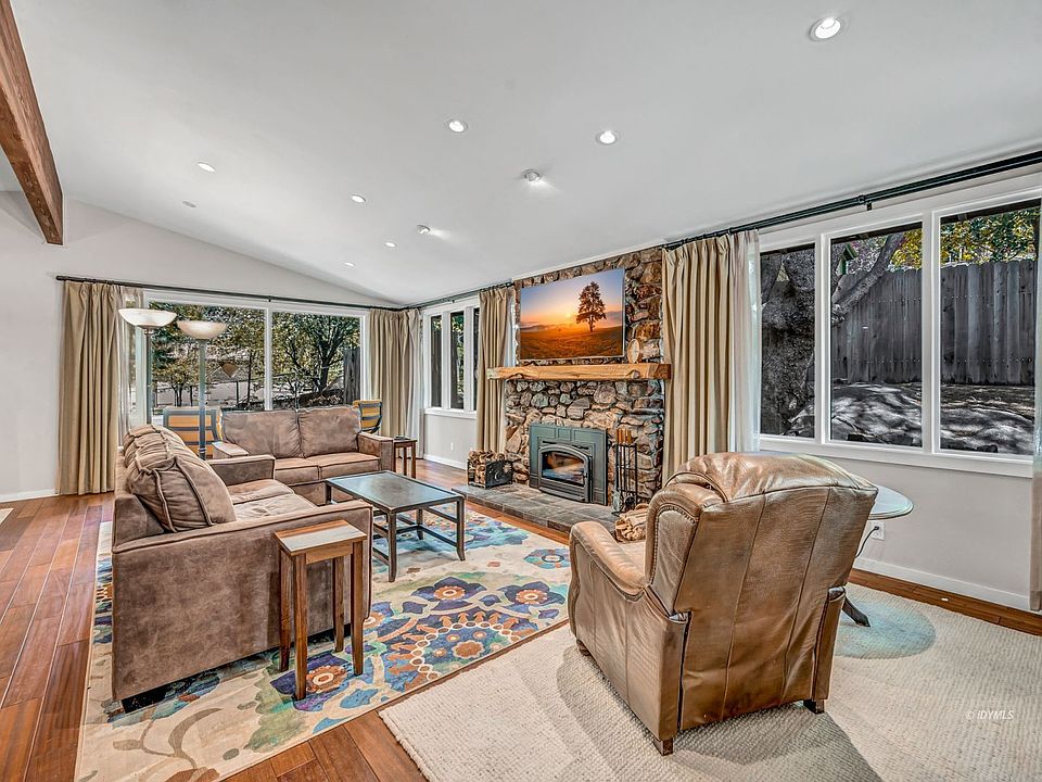 This warm and inviting, single-level, mid-century bungalow-style home was completely renovated in 2007 and includes open-floor-plan design with wood-beams ceilings and skylights. Newer Brazilian Cherry engineered, hardwood flooring in the main living areas and beautiful travertine tile in bathrooms. Further updates include solid core wood doors, Baldwin Hardware locks, recessed lighting, and energy-efficient dual-pane picture windows. The spacious living room features an abundance of windows to bring the forest and perfect light inside. The fireplace now has a newly installed wood-burning stove for cozy winter days. The gourmet kitchen has a lovely view of the spacious backyard, granite counters, quality appliances, and custom cabinetry. Additionally, this home has central air conditioning, single carport, large shed/workshop with electricity, laundry and utility/storage room and cozy office or reading nook. Located perfectly near trails and the charming village of Idyllwild in a peaceful and beautiful neighborhood. New leach lines installed for septic system in June 2021.