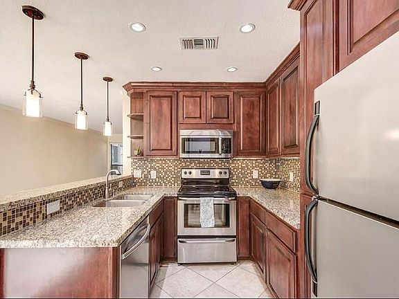 Updated modern bathroomStainless steel appliancesPrivate back patioGranite countertopsWet barCommunity poolCustom built cabinets