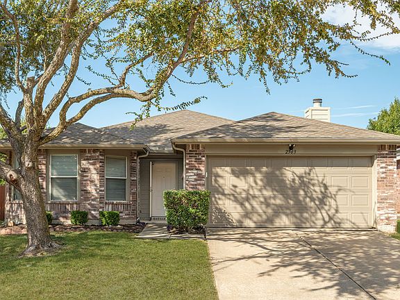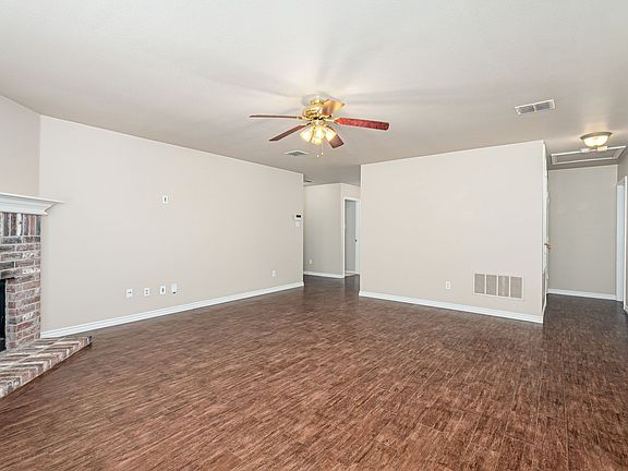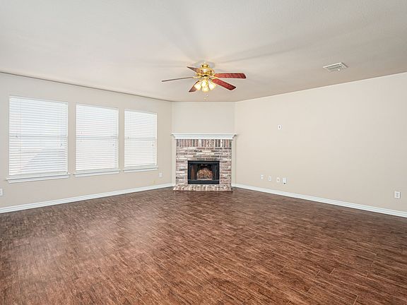 Great open floor plan single story that is move in ready. Wood look ceramic tile flooring in all living areas. Split bedroom floor plan with a private primary bedroom. Updated lighting throughout and ceiling fans in all bedrooms. Stainless steel appliances in the kitchen. The large living area features a corner brick fireplace. An abundance of windows gives bright natural light. Good sized back yard and an open back patio. Freshly stained wood fence. Excellent location with easy access to major highways for commuting.