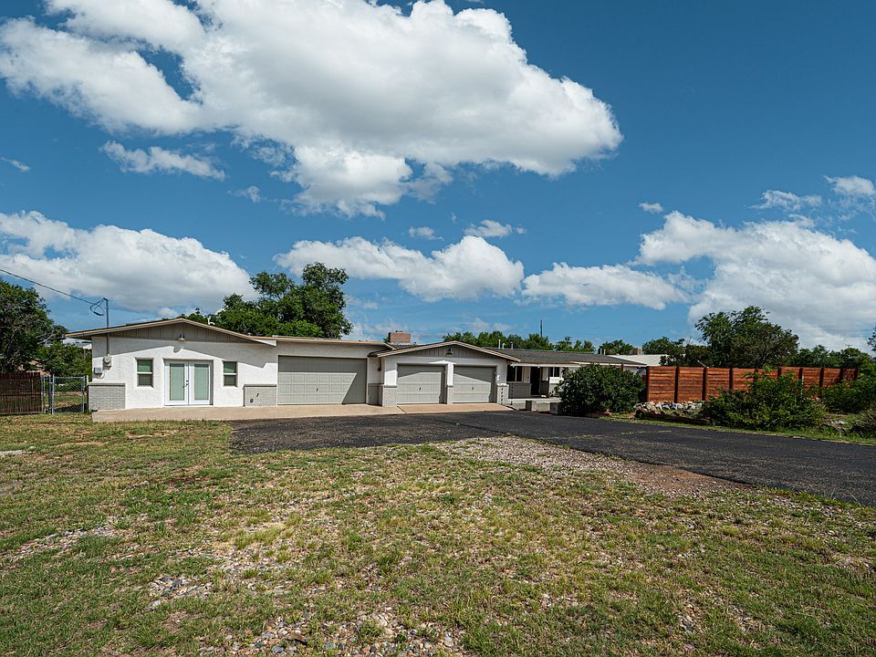 This inviting single level, ranch-style home is sited on nearly 3/4 of an acre in the heart of Santa Fe. The 1916 sqft floor plan features four-bedrooms, three-bathrooms, formal living, dining, den with wood-burning fireplace, and insulated sun room with hot tub. The extensive list of upgrades includes a refreshed kitchen with newer stainless steel appliances and countertops, new windows and flooring throughout, fresh paint, upgraded electrical, on-demand water heaters, and central A/C. Generous living spaces are enhanced by a large rear portal, accessible through sliding doors from the kitchen and French doors from the sunroom, where landscaped grounds create a natural oasis beneath the shade of mature trees. Need more to love? A 466 sqft studio provides added versatility for extended stays or creative use. This bonus space has high ceilings, a mini-split, and is plumbed for a kitchen. Complete with RV hookups in the third garage bay, this R-5 zoned property provides further development by a savvy and value-oriented buyer. Proximity to a neighborhood park and Santa Fe High School, the mid-town location is perfect for easy commutes. This move-in ready charmer of a property offers comfort, versatility, and space in spades.