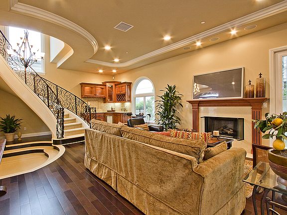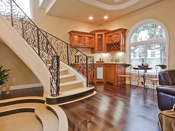 Private backyardFree floating staircaseCustom wrought iron railingLavish bathroomCustom built kitchenAbundance of natural lightCrown and base moldings