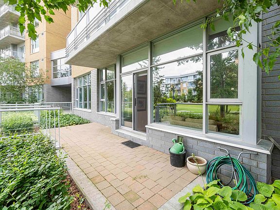 Stylish and refreshed 2 bed, 2 bath condo in sought-after Ermineskin!This beautifully set this ground-floor unit showcases serene courtyard views through a wall of windows and features soaring ceilings that create a bright, spacious feel. Easy to take your pet outside for a walk right outside your doors. Enjoy elegant hardwood floors, granite countertops, and tile in the kitchen and baths. The chef-inspired kitchen includes a gas cooktop, built-in oven and microwave, and smart pull-out cabinetry. The open-concept design is filled with natural light, leading to a large concrete patio surrounded by low-maintenance perennials. With in-suite laundry, titled underground parking & storage, this pet-friendly, well-managed complex also offers an exercise room. Condo fees include heat and water. With a move-in-ready vibe—just steps to grocery shopping, LRT, and green space!