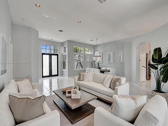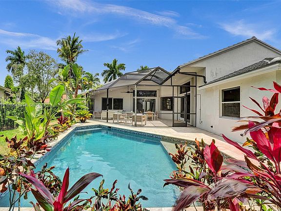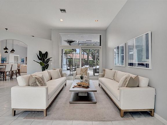 Welcome to this exquisite 5-bed, 3-bath residence in the prestigious Weston Hills CC. This beautifully designed home seamlessly blends elegance with modern convenience, featuring an open-concept layout, soaring volume ceilings, and stylish plantation shutters. The newly renovated primary bathroom, bright white kitchen showcases stunning marble countertops and stainless steel appliances. Bamboo wood flooring enhances the bedrooms, with tile floors throughout the main living areas. Recent updates include a 2022 roof, new A/C, impact sliding doors, accordion shutters, and a 3-car garage. Step outside to the screened patio and enjoy the serene saltwater pool with a sun shelf and fountains set against a travertine pool deck within a fully fenced yard. Optional furniture purchase is available.