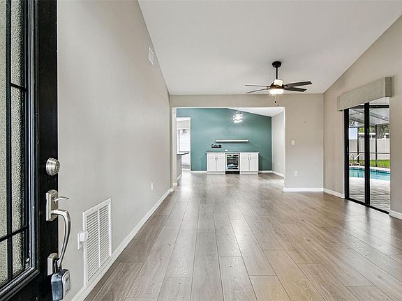 One or more photo(s) has been virtually staged. Stunning home in Crystal Beach Estates, fully remodeled just 2 years ago! Features include a new roof with transferable warranty and no flood insurance required. Enjoy the screen-enclosed in-ground pool with newly refinished surface, fresh pavers, and upgraded patio drainage. Inside, the open split floor plan boasts vaulted ceilings, luxury vinyl flooring, and all-new fixtures and ceiling fans. The modern kitchen showcases stainless steel appliances, custom soft-close wood cabinets, granite countertops, and a convenient wine/coffee bar perfect for entertaining. Both bathrooms have been beautifully updated, while the master suite offers a walk-in closet. Unique upgrades include a laundry room with custom dog wash station and pull-out steps, a quality vinyl fence, whole home R.O water filtration system and fresh landscaping. Located on a quiet street with no deed restrictions and zoned for top-rated schools.