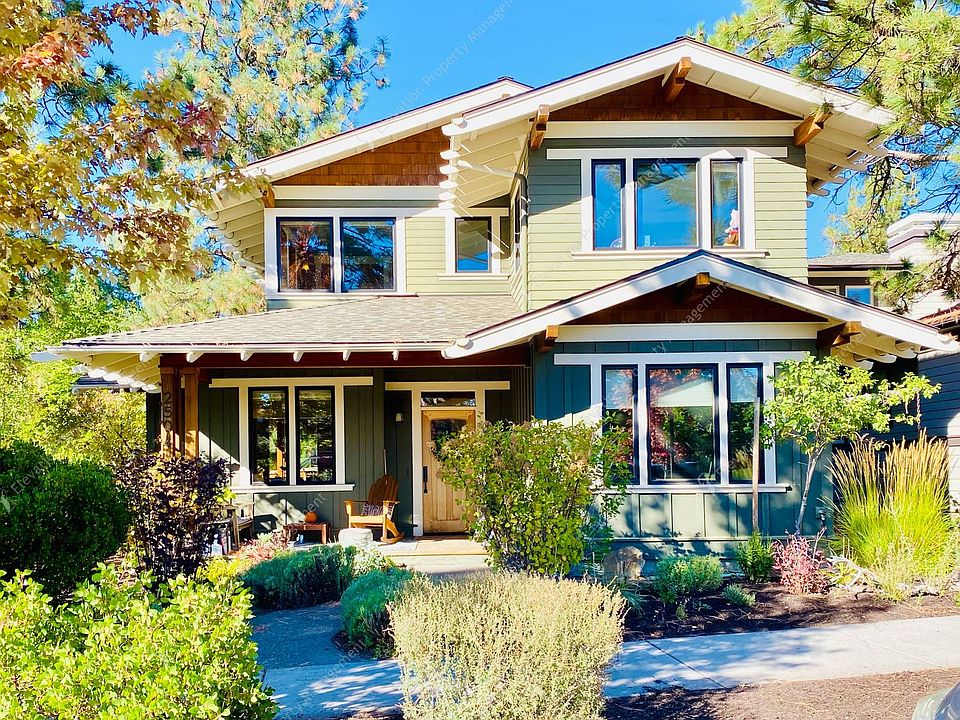 Located on a corner lot, bathed in sunlight, yet dappled in shade, in the heart of Northwest Crossing, this beautiful craftsman home combines modern comfort with the vibrant charm of one of Bend's most desirable neighborhoods. The inviting great room, featuring high ceilings, seamlessly connects the kitchen, dining, and living areas, making it perfect for both relaxed living and entertaining. Large, expansive windows throughout the home offer tree-lined street views, filling the space with natural light.