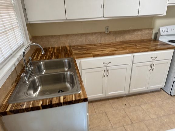 Brand new stoveButcher block countertopNew fixtureStainless steel sinkNew cabinets
