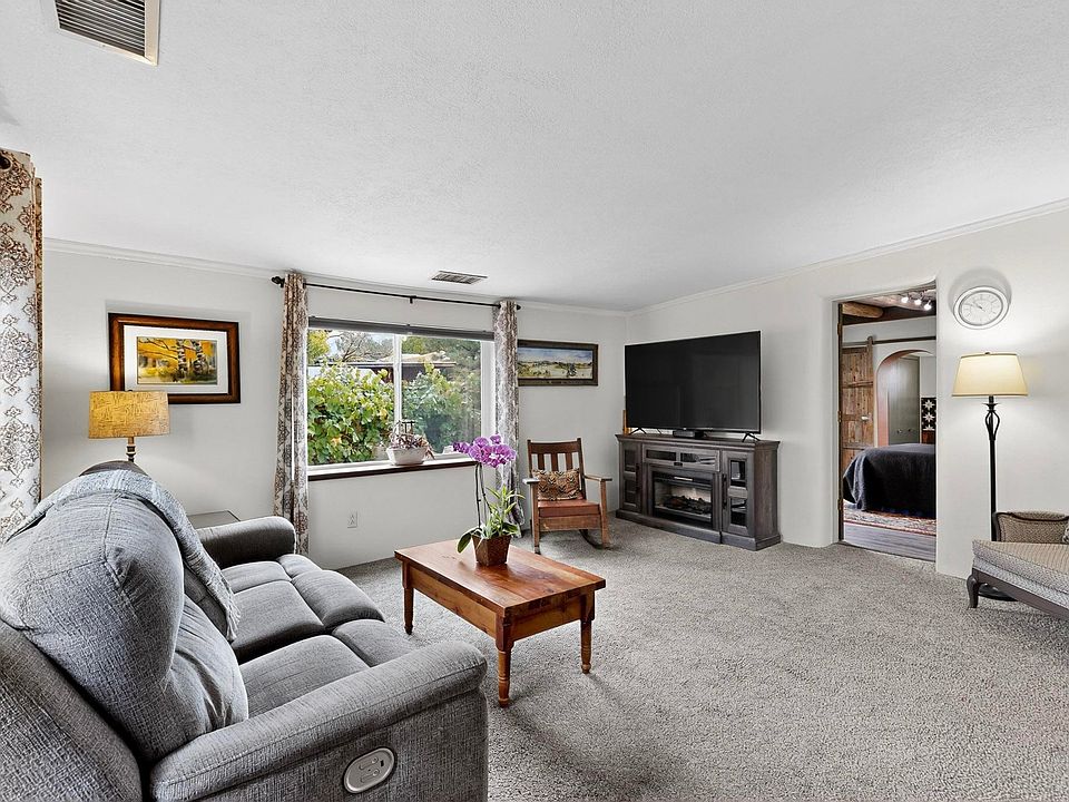 windows, new paint, newer water heater, furnace and appliances. Owners have added a fabulous detached 18’ X 30’ garage, and will convey several sheds, a camping trailer, a green house and a hot tub, if wanted. Also included is fully paid for solar panels that were added in 2024. Lush and charming gardens with fruits, veggies and herbs plus mature trees on irrigation further enhance the property’s appeal. A large basement is accessible from the side of the home for additional storage. Come see this sweet home at your first opportunity!