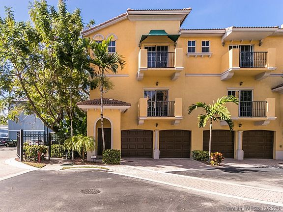 Elegant tri-level corner townhome in the upscale gated community of The Grove At River Oaks. This rarely available 2 bedroom, 2 and 1/2 bath home boasts a double garage and rear fenced patio. Each bedroom has it's own on-suite bath and balcony. Granite kitchen countertops with under counter lighting. Stainless steel appliances. Large master closet including a free standing safe. Wood floors in the main living areas and carpeted bedrooms. Impact glass windows and storm rated doors. Community pool. Conveniently located on Marina Mile near I-95 and the airport. Close to the beaches and downtown Fort Lauderdale