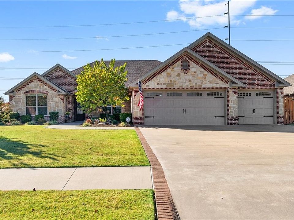 Welcome to Riverwalk Farm Estates, where luxury and craftsmanship shine in this custom brick and stone single-level home. This 4-BR 2.5-BA home is near top-rated Bentonville schools and the Little Osage Creek Trail, connecting to Creekside Park and Bentonville trail system.The wide entryway opens into a large living room with handscraped hardwood floors, cozy gas fireplace, and a coffered ceiling with feature lighting.Kitchen includes a large island, granite countertops and a walk-in pantry, cleverly concealed behind a cabinet door for added elegance.High-end finishes continue throughout, with 10-foot ceilings, extensive crown molding, and custom under-cabinet lighting. The primary suite offers a lighted tray ceiling, while the spa-like bath provides a peaceful retreat. 3 car garage is prewired for electric vehicles and a generator.Outside features covered patio, equipped with a natural gas line for effortless grilling. Neighborhood amenities include a pool, playground, sports courts and more. Don’t miss this gem!