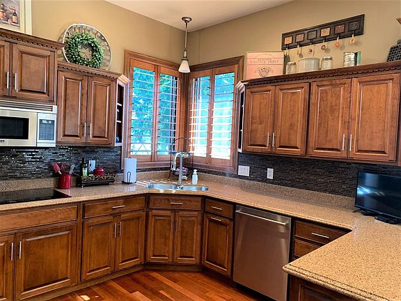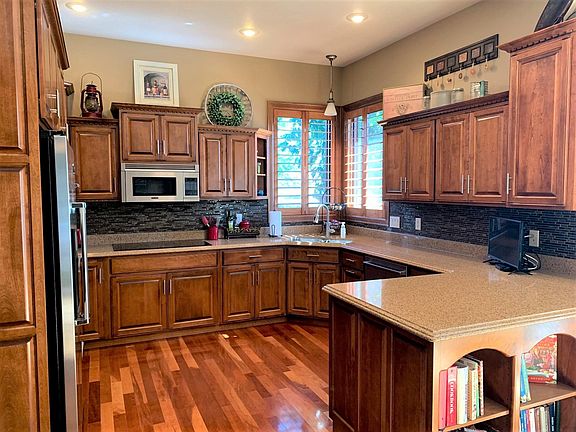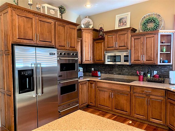 Fabulous 3 Bedroom, 4 bath home located in the Hillcrest Golf Course development. This home offers an open floor plan with solid hardwoods throughout most of the main level. The main level consists of a formal dining room, living room w/gas fireplace, vaulted ceilings and built-ins, eating area with a custom table, built in cabinets and huge patio door out to deck, wet bar area w/sink, large kitchen, master bedroom w/master bath and walk-in closet, main floor laundry and 1/2 bath. The kitchen offers an abundance of custom cabinets as well as Cambria countertops and SS Viking Appliances. The upstairs loft can be used as a den or office and also offers a 1/2 bath. Downstairs you will find 2 additional bedrooms, a 3/4 bath and an expansive family room with a 2nd gas fireplace, several storage closets as well as the mechanical/storage room. Wonderful landscaping surrounds this home. Fenced backyard, pond, deck, mature trees as well as additional newer trees.