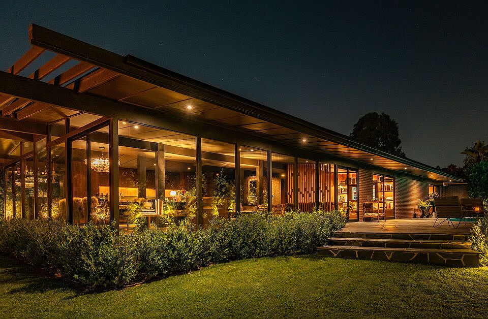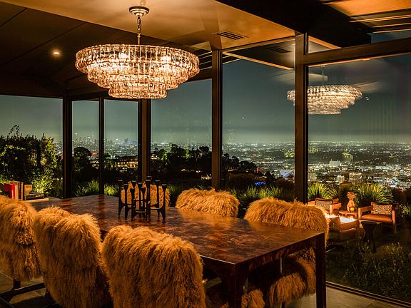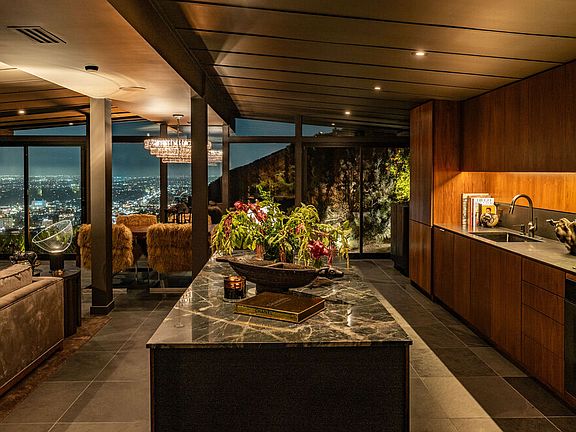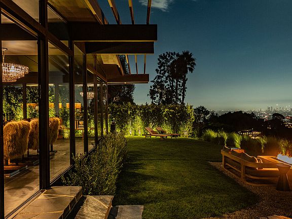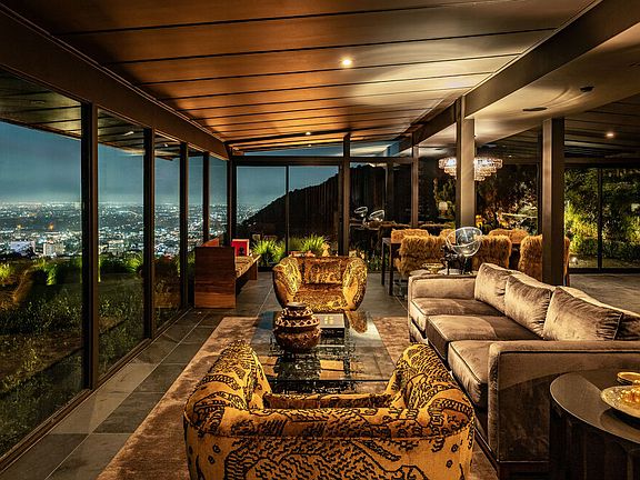 Poised within a sanctuary of architectural beauty and raw natural landscape, this mid-century masterpiece has been reborn--an expression of quiet power, precision, and timeless seduction. Every line refined. Every material intentional. Floor-to-ceiling glass dissolves boundaries between interior and exterior, framing the city skyline like a living work of art. Light moves through the space like liquid, illuminating sculpted forms and impeccable craftsmanship. A complete reinvention from the ground up by Studio Veren: new roof, all new windows, slate floors, Miele appliances, and custom walnut cabinetry throughout. The exterior, once cinderblock, is now fully wrapped in brick--an elegant armor that speaks to permanence and design discipline. Outdoors, flagstone terraces unfold into a private, landscaped retreat. A custom dining banquette captures 360-degree views; a setting that feels cinematic at sunset. Inside, custom furnishings are handcrafted for each room, draped in fabrics from Dedar, Schumacher, Perennials, and Pierre Frey. Vintage lighting and curated accessories punctuate the modern calm with soul and sophistication. Two car garage with Tesla charger.