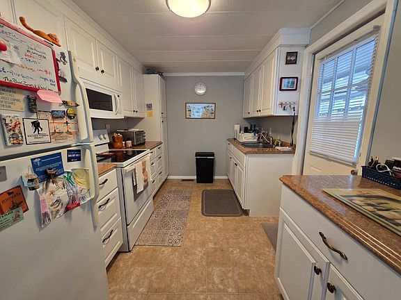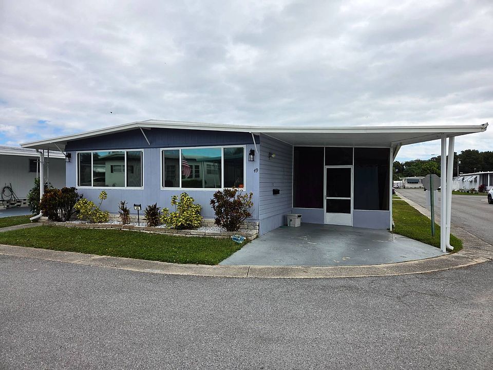 This 2 bed 2 bath home is located in Eldorado Village a 55+ Community. The home has vinyl siding, central HVAC system (with heat pump), new energy efficient windows (with window tint), roof over, gutters, carport, screen room & a storage shed (with washer & dryer). The interior of the home has updated kitchen cabinets, laminate countertop, appliances (including refrigerator, microwave & stove), laminate flooring, vinyl flooring (in kitchen and both bathrooms), new shower in the hallway bathroom & both bedrooms have en suite bathrooms. Community Amenities Include: spa, heated pool, horseshoe pit, shuffleboard court, billiard room, library, laundry facilities it is a waterfront community & pets are allowed (pet restrictions: 2 per home; 25 lbs. limit). You can rent the home out to park approved tenants. Lot rent is $943 per month which includes water sewer trash and landscaping.