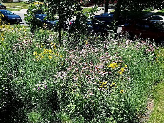 Enjoy outdoor living with a fenced backyard featuring a pergola-covered patio and gardens, detached 2-car garage, plus a front yard landscaped with native prairie grasses and wildflowers.