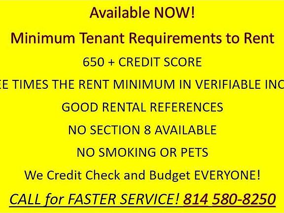 Minimum one year lease. Tenants pay all utilities. We provide landscape maintenance and plowing.