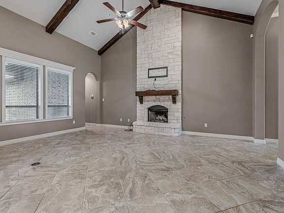 This beautifully designed home blends warmth and sophistication with an open layout, rich architectural details, and exceptional finishes. The living area features a soaring cathedral ceiling accented by wood beams and a striking limestone fireplace. In the kitchen, a large granite island, gas cooktop, wall oven, and built-in microwave create a perfect balance of style and function. The primary suite offers a peaceful retreat with a wood-beam tray ceiling and a spa-inspired bath featuring dual vanities, a soaking tub, walk-in shower, and two spacious closets. A covered patio and fully fenced backyard provide inviting spaces to relax or entertain, while a custom mudroom keeps everything effortlessly organized.
