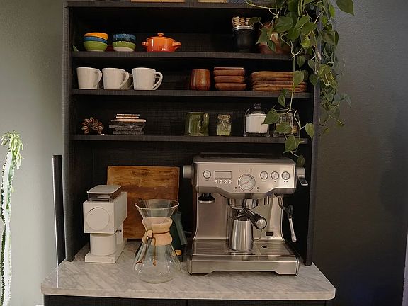 - Full-size kitchen appliances: electric stove + oven, large microwave, refrigerator with freezer & cocktail ice cubes, full-size dishwasher, faucet water filter