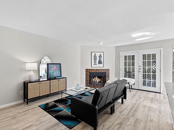 Cozy wood-burning fireplaceNew dishwasherSolid surface countertopsSerene tree-lined communityLower level corner unitSparkling community poolWhite cabinetry